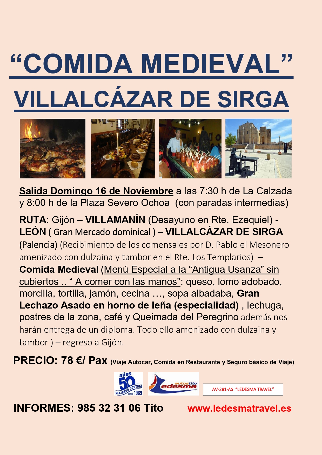 RUTA: Gijón – VILLAMANÍN (Desayuno en Rte. Ezequiel) – LEÓN ( Gran Mercado dominical ) – VILLALCÁZAR DE SIRGA (Palencia) (Recibimiento de los comensales por D. Pablo el Mesonero amenizado con dulzaina y tambor en el Rte. Los Templarios) – Comida Medieval (Menú Especial a la “Antigua Usanza” sin cubiertos .. “ A comer con las manos”: queso, lomo adobado, morcilla, tortilla, jamón, cecina …, sopa albadaba, Gran Lechazo Asado en horno de leña (especialidad) , lechuga, postres de la zona, café y Queimada del Peregrino además nos harán entrega de un diploma. Todo ello amenizado con dulzaina y tambor ) – regreso a Gijón.