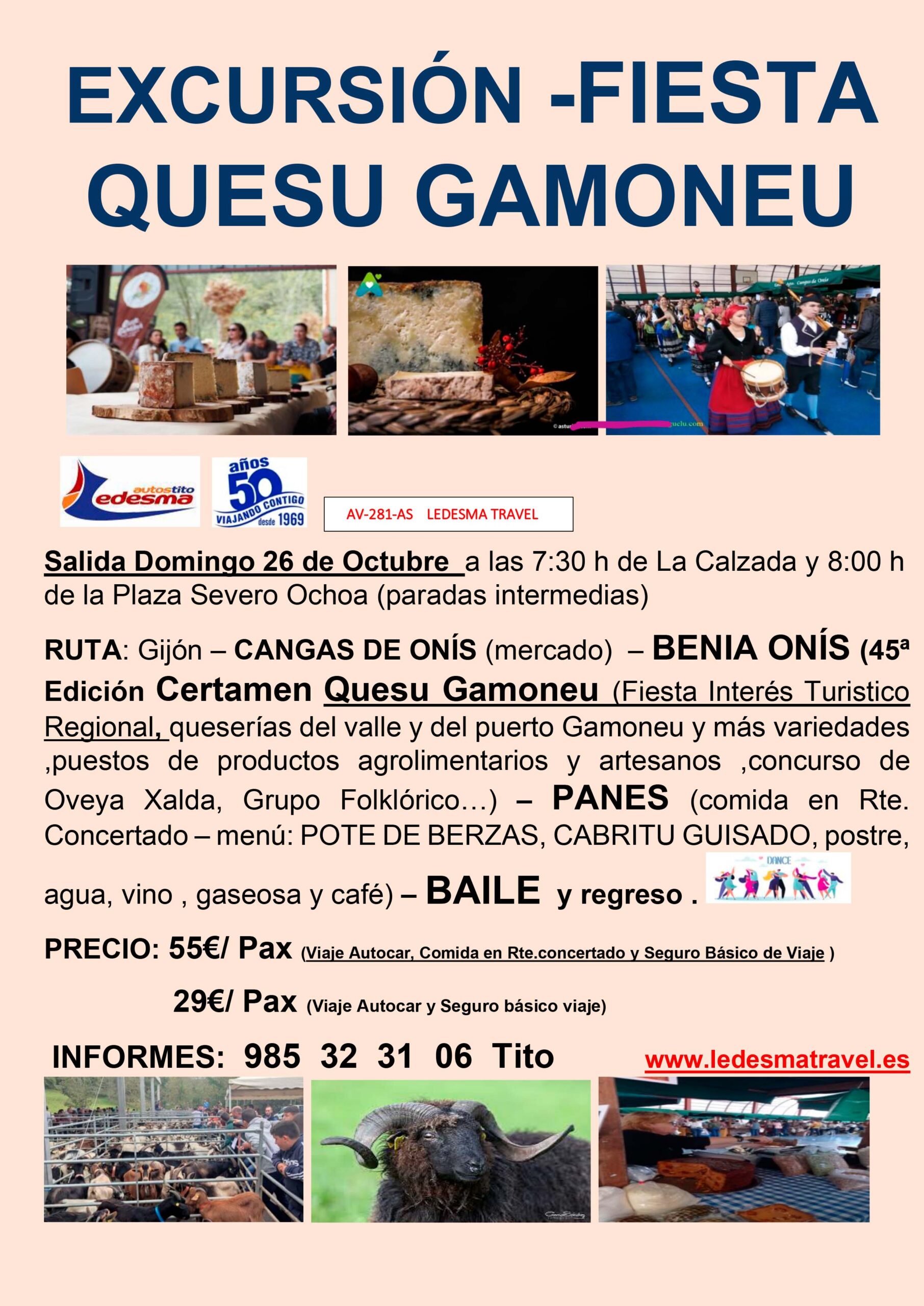 RUTA: Gijón – CANGAS DE ONÍS (mercado) – BENIA ONÍS (45ª Edición Certamen Quesu Gamoneu** (Fiesta de Interés Turístico Regional), queserías del valle y del puerto Gamoneu y más variedades, puestos de productos agroalimentarios y artesanos, concurso de Oveya Xalda, Grupo Folklórico…) – PANES (comida en Rte. Concertado – menú: POTE DE BERZAS, CABRITU GUISADO, postre, agua, vino, gaseosa y café) – BAILE y regreso.