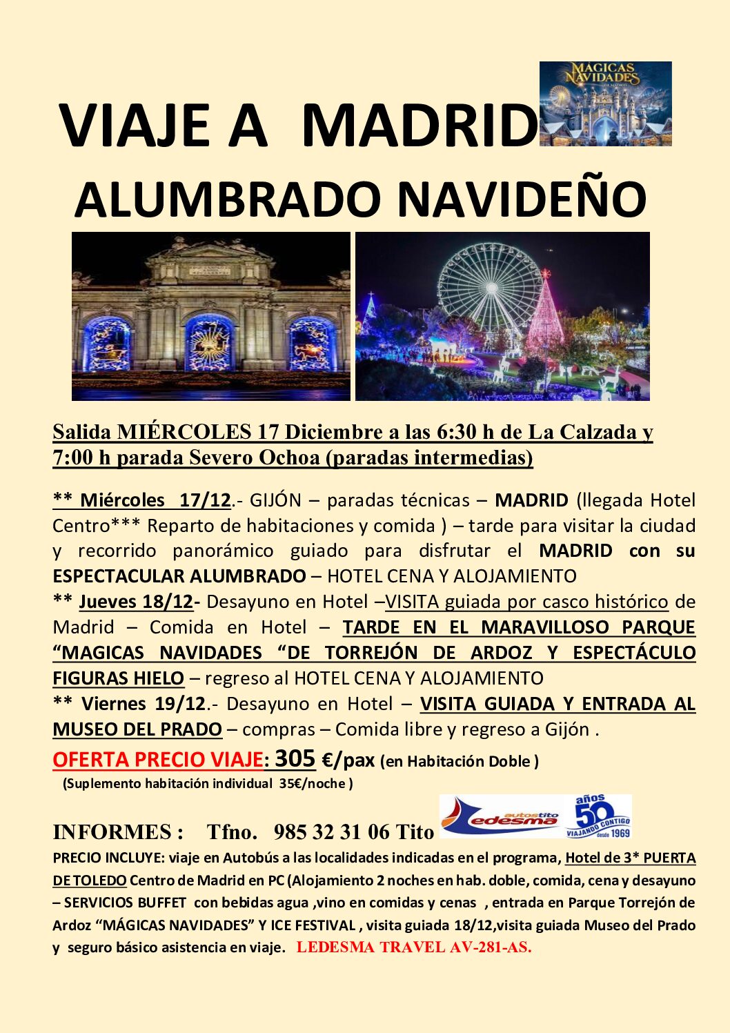 Salida MIÉRCOLES 17 Diciembre a las 6:30 h de La Calzada y 7:00 h parada Severo Ochoa (paradas intermedias)